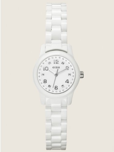 Bring your outfit to life with a pop of color. Tonal and pristine, this casual timepiece is a lively accessory for any day of the week. ? Analog function ? Watch dimensions in mm: 26/26/10 ? Polished white case ? White dial ? Polished white polycarbonate bracelet ? Water Resistant ? 10 Year Limited Warranty Women's Accessories > Watches > Guess Watches