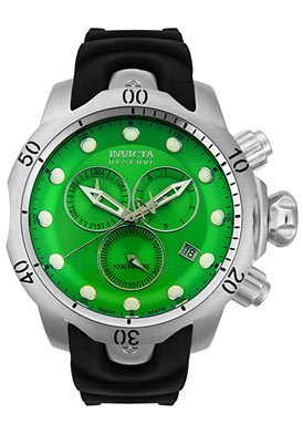 Stainless steel case with a black leather bracelet. Unidirectional stainless steel bezel. Green dial with luminous hands and hour markers. Date display at the 4 o'clock position. Chronograph - three sub-dials displaying: 60 seconds, 30 minutes and 1/10th of a second. Swiss quartz movement. Scratch resistant flame fusion crystal. Skeletal case back. Case diameter: 52 mm. Case thickness: 22 mm. Tang clasp. Water resistant at 1000 meters / 3300 feet. Invicta- Subaqua Reserve Venom Chronograph- Mens Watch 6110.